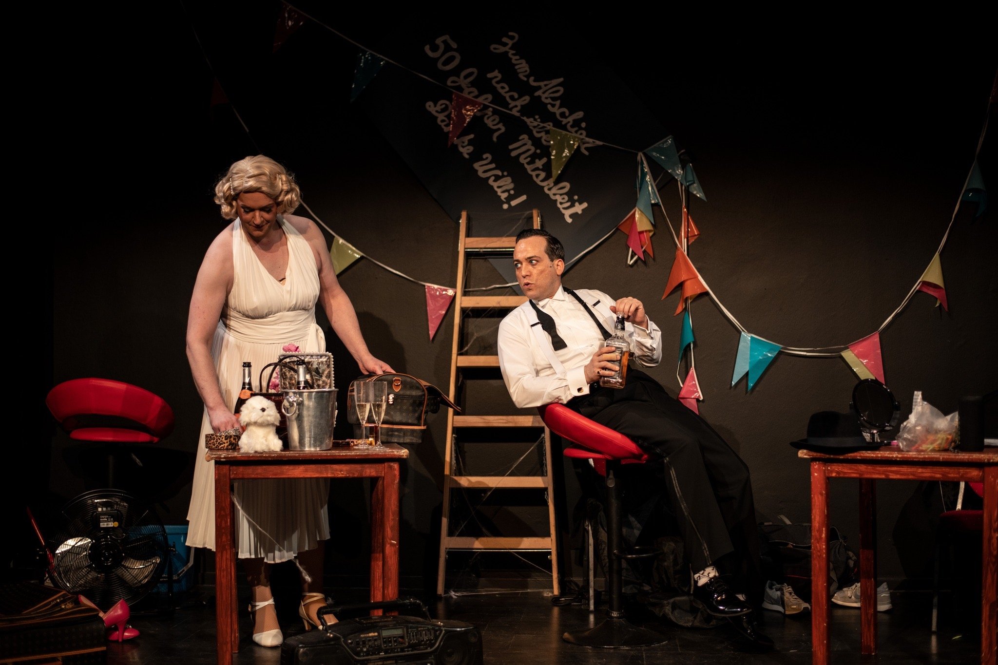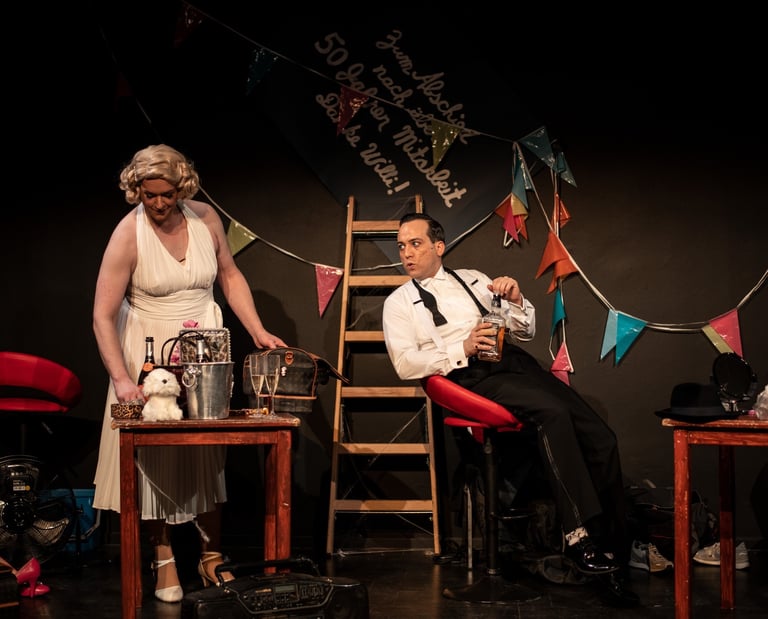 Wer kennt sie nicht – die Frage, welcher Berühmtheit man denn ähnlich sehe? Doch sieht man einer bekannten Persönlichkeit zu ähnlich, kann daraus sogar ein Beruf werden. Der Imitator. Er kommt immer dann zum Einsatz, wenn das Original nicht auftreten kann oder will. Meist steht er im Schatten, in der zweiten Reihe. Bis er, als täuschend echte Kopie, doch mal ins Rampenlicht tritt. So auch an diesem Abend: Zwei Imitatoren sollen ein Autohaus eröffnen, weil sich die echten Stars für so einen Termin nie buchen ließen. Es wäre ohnehin schwierig – sie sind längst tot. Also versuchen sich Frank Sinatra und Marilyn Monroe in einem eher notdürftig umfunktionierten Raum, der als Garderobe herhalten muss, auf ihren Auftritt vorzubereiten. Die Kulisse: schäbig. Die Situation: absurd. Der Ton: melancholisch. Ulf Dietrich entwickelt gemeinsam mit Giovanni Rupp und Stephan Vanecek einen Abend, in dem es um vieles geht: Das Leben als Darsteller, die Abgründe des Bühnendaseins und die Einsamkeit all jener, die immer in der zweiten Reihe stehen und manchmal trotzdem alles geben. Zwei Imitatoren, ein schäbiges Hinterzimmer, große Namen und noch größere Träume. Mit einer Mischung aus Melancholie, Witz und bitterer Wahrheit erzählt der Abend vom Leben in der zweiten Reihe.